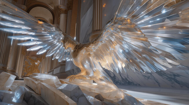 Abstract Angelic Forms: Ethereal figures with glowing fragmented wings in a fresco style with a harp a scroll and a marble cathedral interior. three quarter wide angle