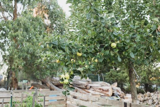 Yellow apples on a green leafy tree in a home orchid