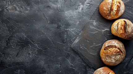 A top view of freshly baked bread sliced on black slate, mustard linen, cream knife