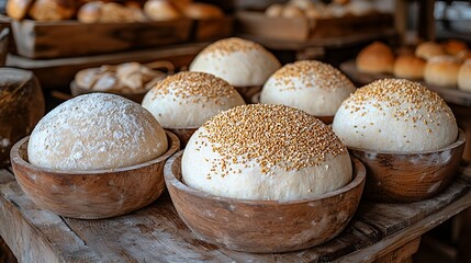Variety of artisanal bread loaves displayed on rustic wooden table with soft natural light and blurred background showcasing bakery shelf.
