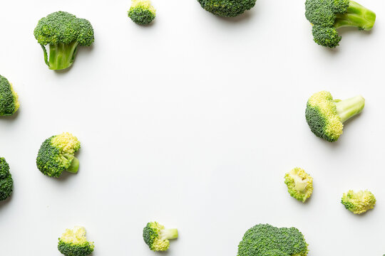Flat lay composition with fresh green broccoli frame eith copy space on light background