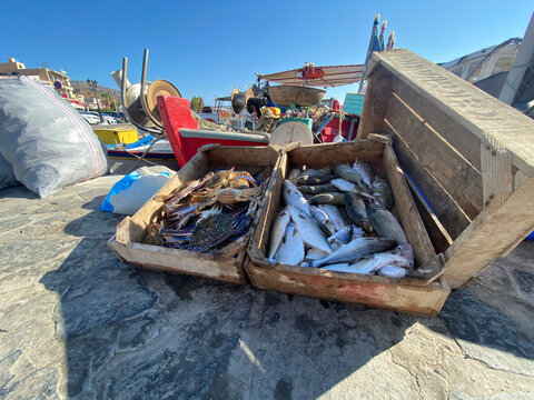 Freshly caught amberjack fish arranged on crushed ice, showcasing their vibrant colors and glistening scales with herbs in the background.