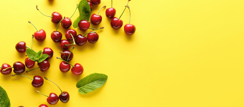 Cherries. Sweet Cherries. Fresh Cherries. Ripe cherries on wooden concrete table - board.