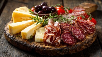 Close-up of a rustic wooden board laden with an assortment of gourmet cheeses, cured meats, fresh olives, and cherry tomatoes