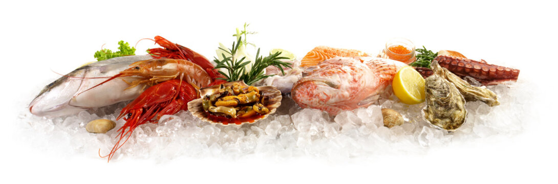 Fish and Sea Food on Ice with Sea Weed, Caviar, Mussels, Oysters and Scallop isolated on white Background - Side View Banner
