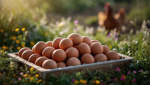 fresh farm eggs in a ceramic bowl placed on hay inside a rustic wooden chicken coop with a chalkboard sign and morning sunlight from a window, concept of egg farming, local food, homestead core