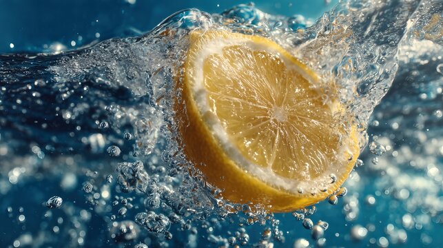 A fresh lemon slice is dropped into clear blue water, creating a dynamic splash with droplets flying in all directions, capturing a refreshing moment in bright lighting.