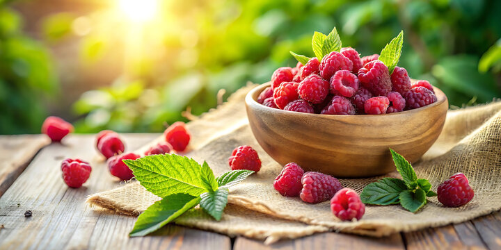 A rustic wooden bowl overflowing with ripe, red raspberries and fresh mint leaves, set on a burlap cloth on a wooden table with soft sunlight filtering through green foliage in the background