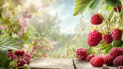 A bunch of red raspberries are on a wooden table. Free copy space for banner.