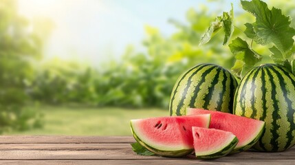 Whole and sliced fresh watermelon on a rustic wooden table, showcasing vibrant red flesh and green striped rind, perfect for summer themes.