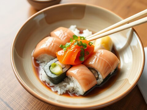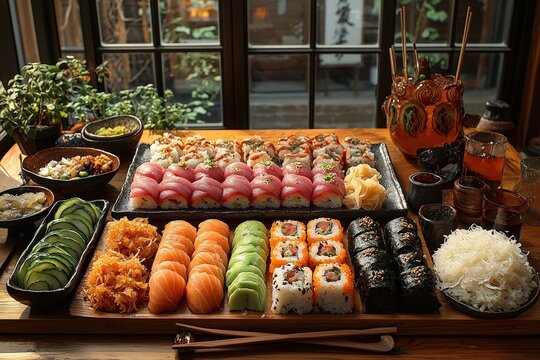 Vibrant assortment of sushi and sashimi displayed on a wooden table, waiting to be savored
