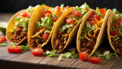 Delicious freshly made tacos overflowing with savory ingredients and vibrant toppings on a rustic wooden surface