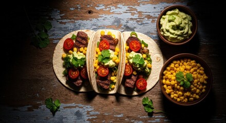 Three savory beef tacos with fresh guacamole, corn, and tomatoes presented on a rustic wooden table