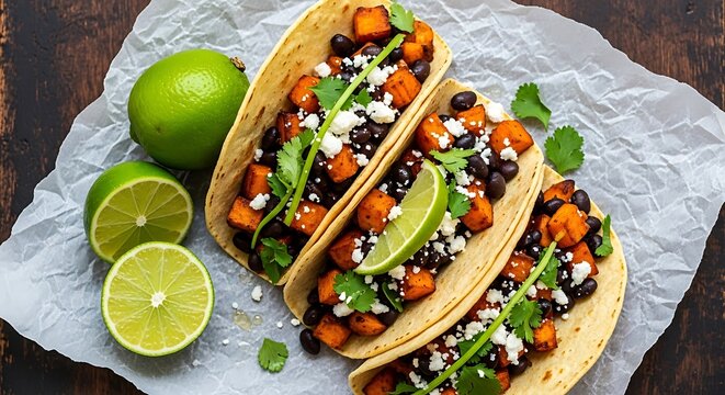 Delicious Looking Sweet Potato and Black Bean Tacos with Lime Garnish Food