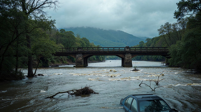 Coche sumergido en río crecido bajo un puente después de una inundación