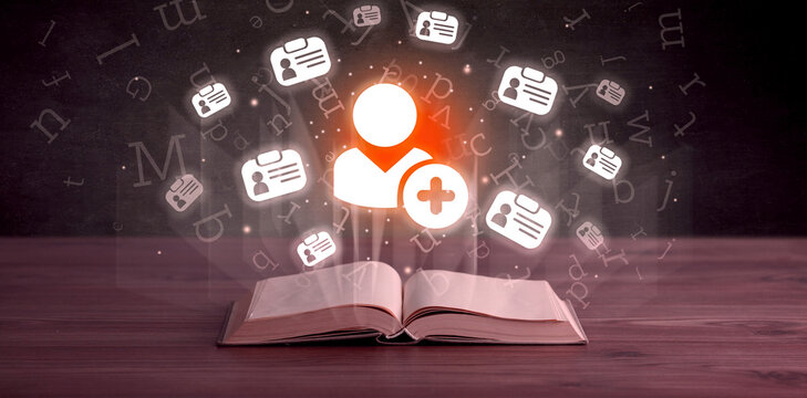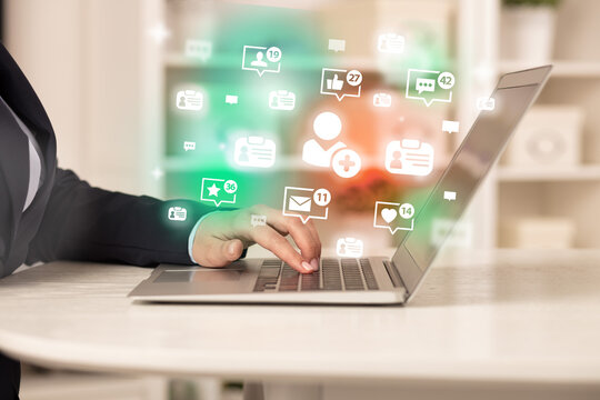 Hand pressing social media multimedia application screen with media icons on futuristic concept