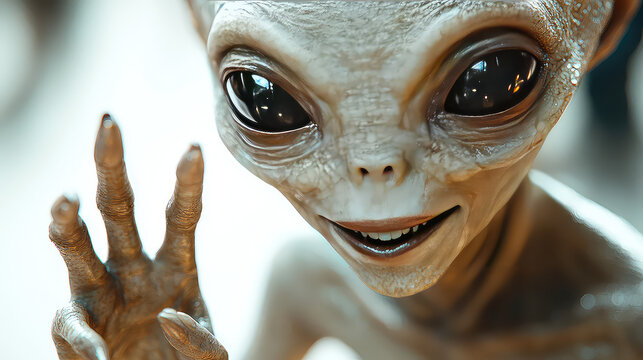 An imaginative alien figurine poses with a thumbs-up gesture, exuding a playful and friendly vibe, showcasing creativity and whimsy in a unique, close-up perspective captures the fun in alien art.