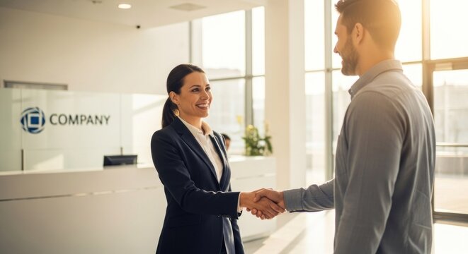 Portrait of friendly female boss shaking hands with new team member on sprint meeting.