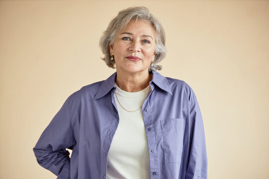 Portrait of an elderly Caucasian woman smiling while wearing lavender shirt and white top. She is standing against neutral background with relaxed posture and friendly expression