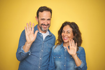 Young handsome man with beard wearing casual sweater standing over yellow background smiling doing phone gesture with hand and fingers like talking on the telephone. Communicating concepts.