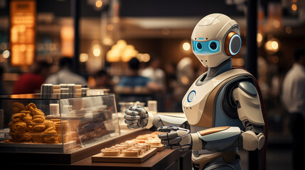 Friendly service robot in cafe setting image background. Robotics in customer service photography. Bakery picture scene. Electronics artificial intelligence concept photo copy space