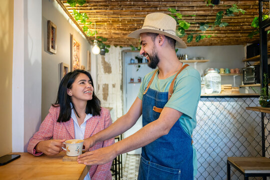 Friendly Waiter Serving Coffee In Cozy Rustic Cafe Images
