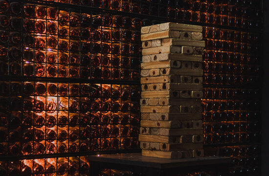 Friends Enjoying Jenga Game And Drinks At Bar Gathering Images
