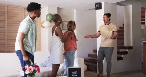 Friends celebrating at home with balloons and flowers