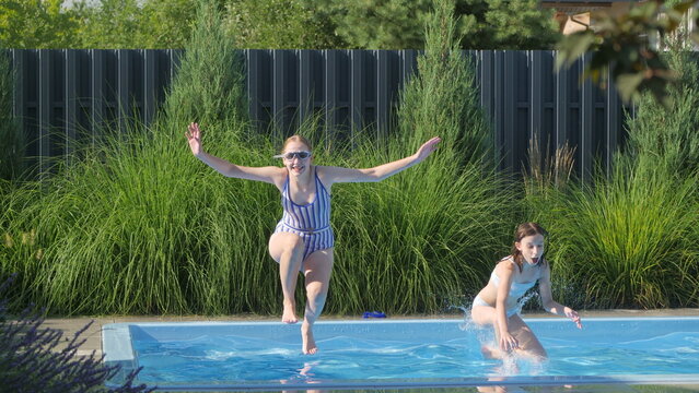 Two teenage girls in swimsuits joyfully jumping into a backyard pool on a sunny day.