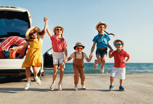 Multiethnic people loading baggage in trunk, preparing car with trolley and travel bags to leave on holiday trip. Travelling together on vacation adventure during summer, seaside journey.