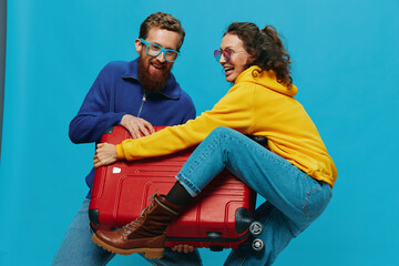 Woman and man smile suitcases in hand with yellow and red suitcase smile fun, on blue background, packing for a trip, family vacation trip.