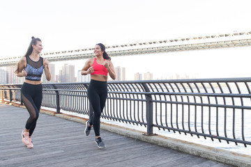Two women running  together outside on a pier near water