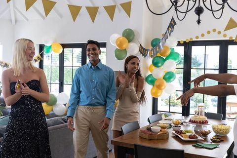 Festive birthday celebration with diverse friends at home