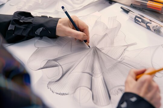 designer smoothing out a sketched frill on paper with a pencil