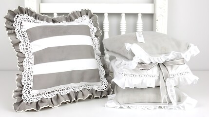 Elegant striped cushion and stacked frill pillows against white backdrop