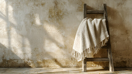 Rustic wooden ladder with a fringed throw blanket against a textured wall in soft, natural lighting.
