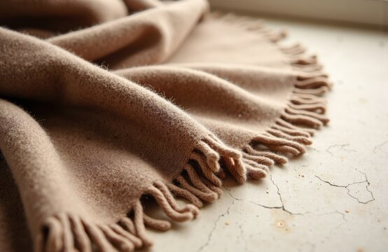 Soft beige wool blanket with fringed edges draped on a textured surface