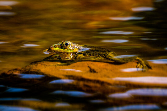 Peacock Tree frog on a Pink gerbera plant in a reflection pool