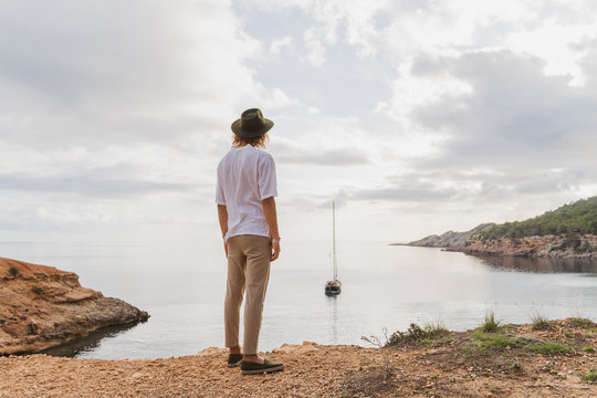 Back view of young man standing in front of the sea looking at view