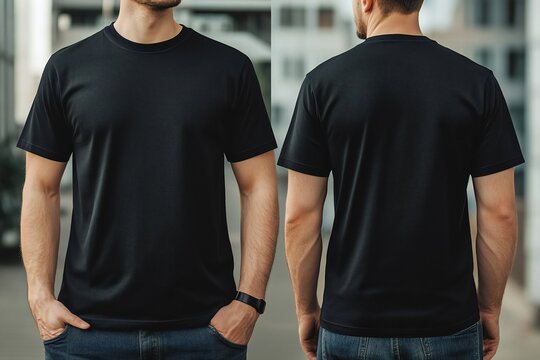 A black t-shirt is shown from the front and back, providing a blank template for design or branding purposes.