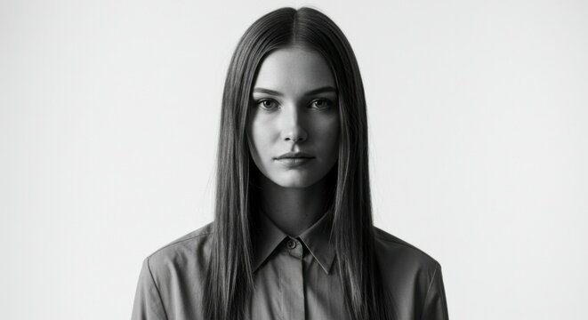 Serious pretty freckled young woman front head shot indoor portrait. Student teenage girl, female model with spotted facial skin wearing casual, posing at home, looking at camera