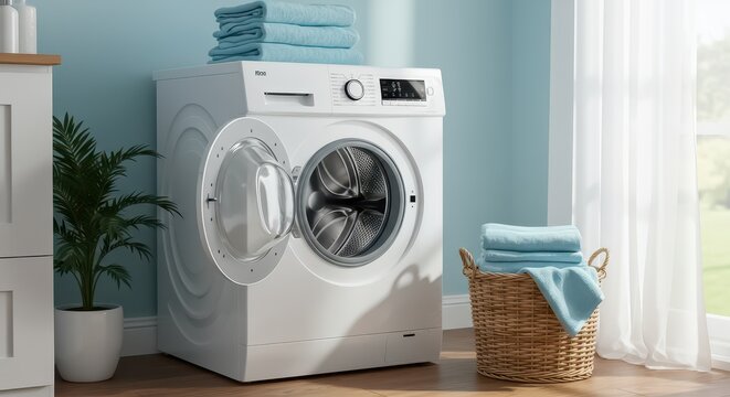 Modern washing machine with front loading design in a bright, minimalistic setting