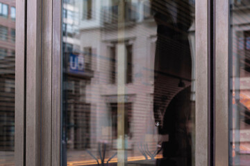 Senior receptionist handing documents across front desk in bright modern lobby with plant