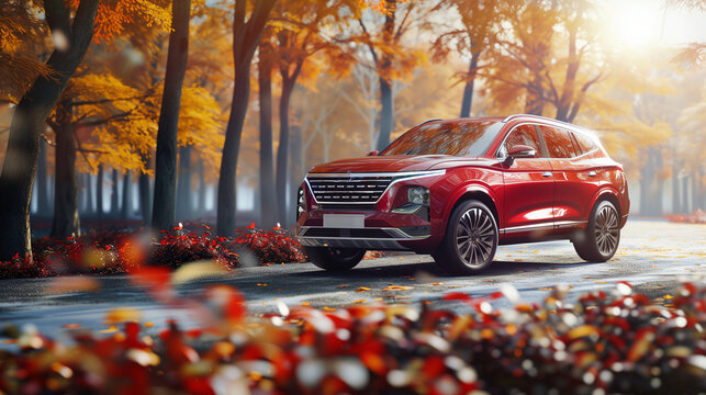Car parked on street,Car on road and sunset background,Tire of car on road
