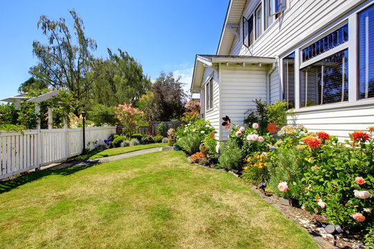 Luxurious suburban house with a beautifully landscaped front yard and colorful flower garden on a sunny day.