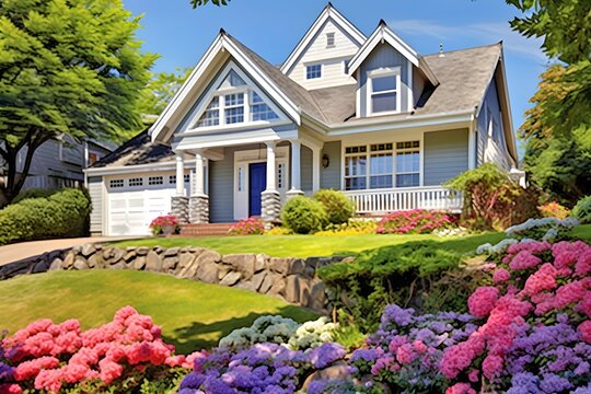Colorful flower beds enhance the beauty of a well-kept front yard on a sunny day