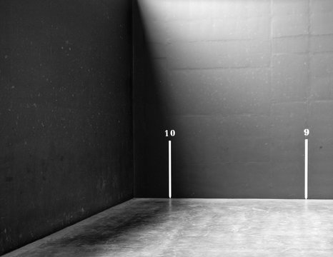 fronton wall in the Basque ball sport, in which the game marks are painted with the numbers 3 in the middle and 2 and 4 on both sides. Above the number 3 there are two Basque flags and the word, Motz,