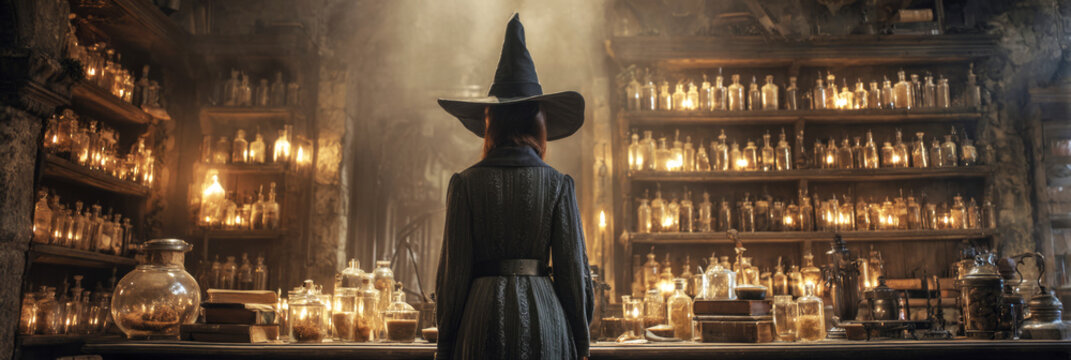 In an enchanting autumn setting, a young witch dressed in a detailed costume stands in front of shelves filled with glowing potions and ancient spell books, embracing the Halloween spirit