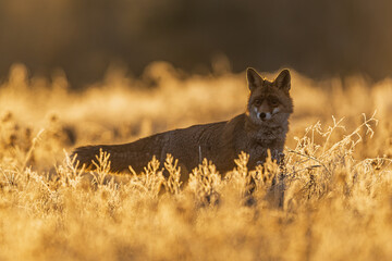 Vulpes vulpes Red Fox lies in golden grass glowing in low sunrise.j