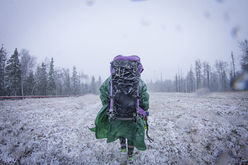 Caucasian hiker standing in frosty field